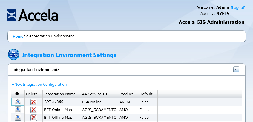 The Accela Silverlight GIS Administration site displays the Edit Integration Environment page.