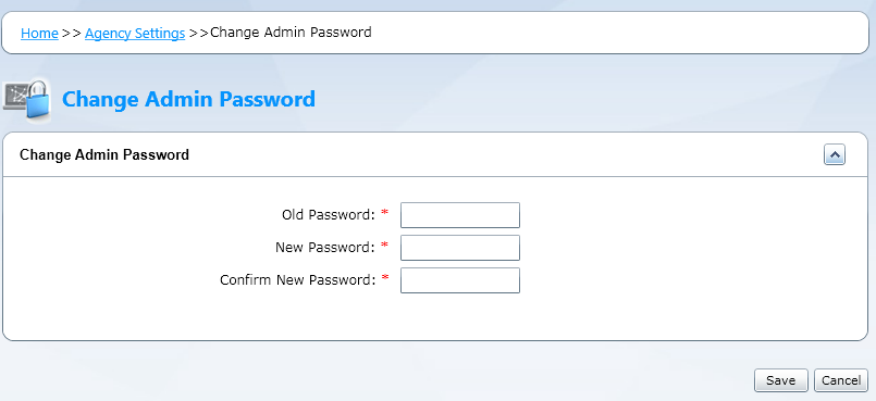 Old Password Enter the current Accela Silverlight GIS Administration site password. New Password Enter the new Accela Silverlight GIS Administration site password. Confirm New Password Re-enter the new Accela Silverlight GIS Administration site password. Click the Save button.