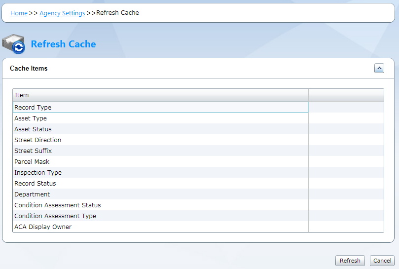Table 1. Cache Items Cache Item Description Record Type When you add or delete record types in Civic Platform, clear the cache to show the most current options in the following windows: Accela Silverlight GIS > Search panel > Search by Records > Type > Select Record Type