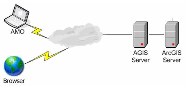 If your agency is using Accela GIS in Citizen Access or Mobile Office, then your agency installs Accela GIS in a demilitarized zone (DMZ) on a separate machine than the ArcGIS server. It is likely that your agency installs Citizen Access or Mobile Office on the same machine as Accela GIS, and that machine is publicly accessible. However, if your agency is using Accela GIS in Civic Platform, then your agency installs Accela GIS in an Intranet zone on a separate machine than the ArcGIS server. A tier of communication exists between the Accela GIS client machine and the Accela GIS server, and another tier of communication exists between the Accela GIS and ArcGIS servers. See Figure 1 for the illustration that shows how an agency integrates the GIS system with Mobile Office.