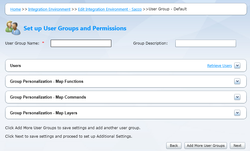 User Group Name Enter a unique name to identify the Accela Silverlight GIS user group, such as Asset Management Accela Silverlight GIS users or Land Management Accela Silverlight GIS users. Group Description Enter a description of the Accela Silverlight GIS user group you create, such as Traffic Light Maintenance Group.