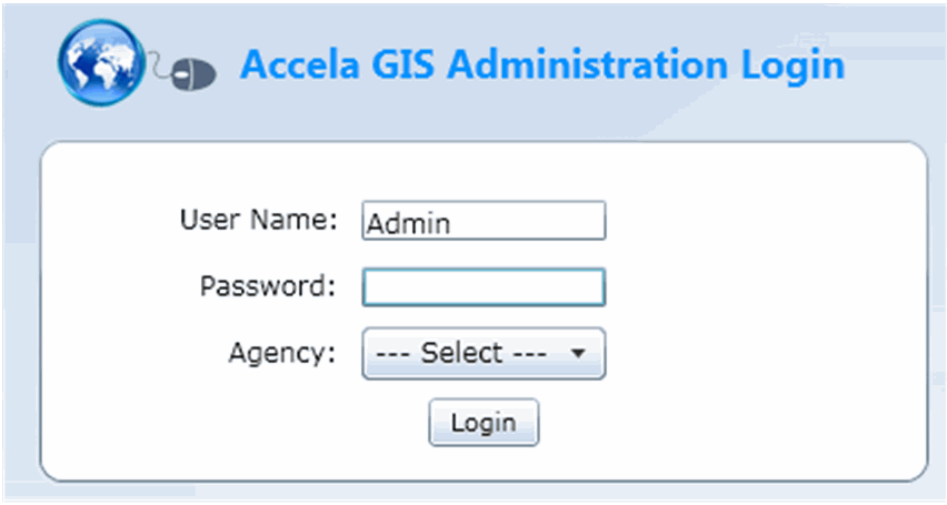 To access the Accela Silverlight GIS Administration site, you must first log in with your user name and password. Maintain site security by keeping your password confidential.