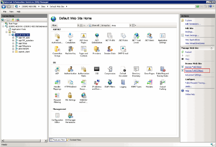 IIS Manager displays the Browse *: 443 (https) link in the Browse Web Site area of the Actions pane.