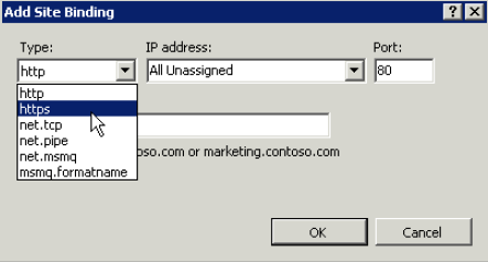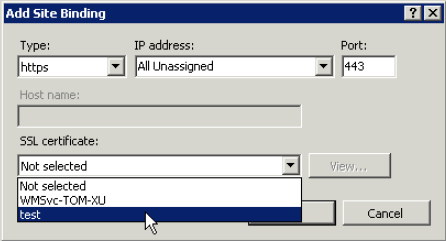 Type Select “https” from this drop-down list. Then IIS Manager refreshes and displays the Add Site Binding dialog box as follows: IP addresses Select “All Unassigned” from this drop-down list. Port Enter any desired port number. By default, it is 443. SSL certificate Select the SSL certificate that you have obtained and installed from the certificate authority. Click the OK button to close the Site Bindings dialog box, and then click the Close button to close the Add Site Binding dialog box.