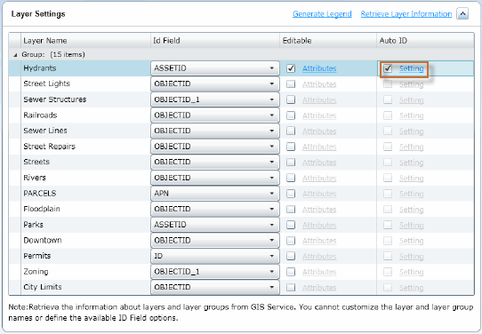 To auto-generate the feature ID when users create a GIS feature, mark the check box in the Auto ID column.