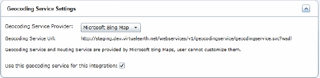 Mark the Using this geocoding service for this integration check box if you want the geocoding service from Bing Maps to be the default geocoding service in your map integration environment. Otherwise, clear this check box.