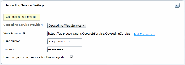 Web Service URL Enter the URL of a custom geocoding web service. User Name Optionally, enter your user name along with the password for connecting to the geocoding web service. Password Optionally, enter your password along with the user name for connecting to the geocoding web service. Using this geocoding service for this integration Mark this check box if you want the geocoding web service to be the default geocoding service in your map integration environment. Otherwise, clear this check box.