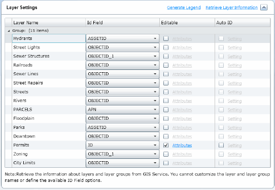 Layer Name Layer groups and names are automatically retrieved when you select a map service. By default, this column is expanded and displays all the layer groups and names. ID Field This drop-down list displays the available attribute fields for the selected map layer. Select an identification field for each map layer. Editable Mark the check box next to the map layer that you want to make editable, then click the Attributes link to configure which attributes are editable.