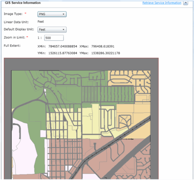 Retrieve Service Information Click this link to replace the attribute settings of the selected map service with the default map service attribute values. Zoom in Limit Set the map zoom-in limit by entering a value in this field.