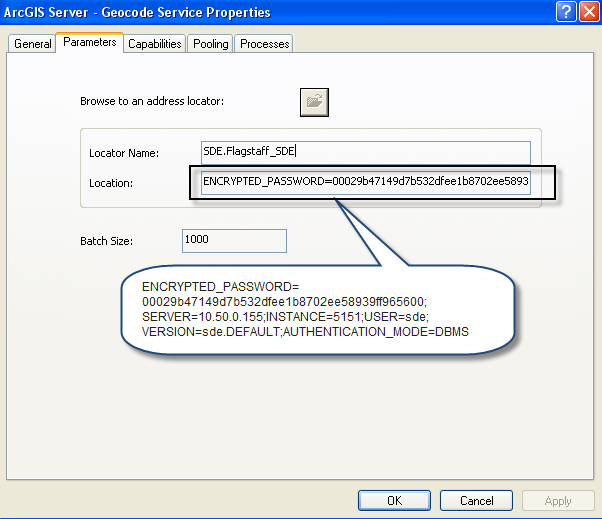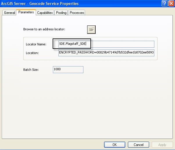 If the geocoding service uses a data source other than SDE, enter the location just as shown in the Location field of the ArcGIS Server - Geocode Service Properties window.