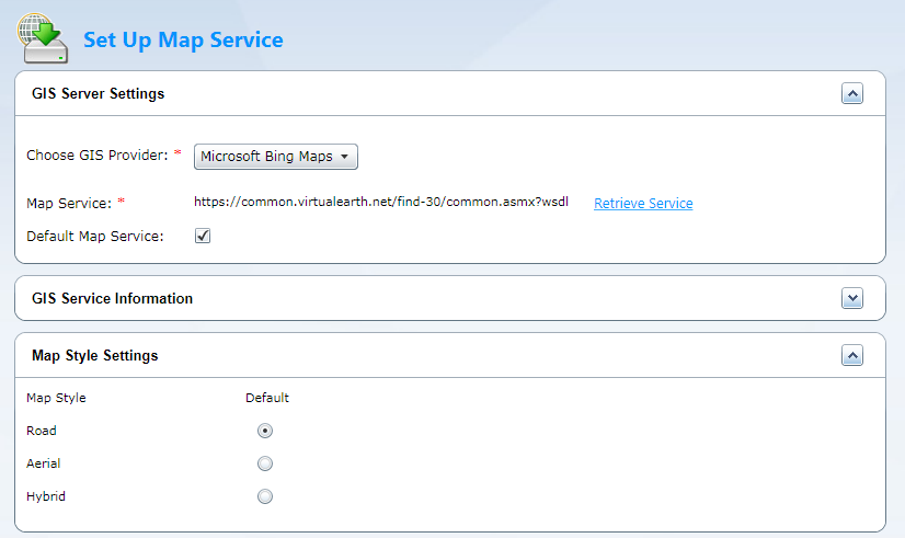 If you choose Microsoft Bing Maps or ESRI ArcGIS Online Base Map, set a default map style. For instructions on the map style settings, see Configuring Map Style Settings.