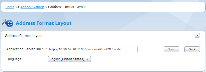 Application Server URL Enter the URL of the application server for Civic Platform where your agency defines the address format and address form layout. Language Select the preferred language for the address form on the Search panel in the Accela Silverlight GIS map viewer. For example, select “English (United States)” if you want the address form to display labels, options, and other user interface elements in American English.