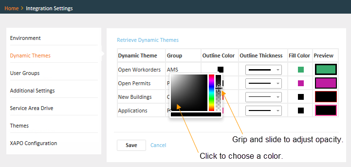 To customize the fill color and opacity for a specific dynamic theme, click its Fill Color icon using the color picker and opacity slider widgets.