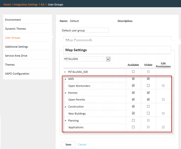 To make the dynamic theme available to the user group, mark the Available checkbox for that dynamic theme layer. If a dynamic theme is marked as available, an end-user sees the dynamic theme on the Layers widget and has the ability to show or hide the dynamic theme.