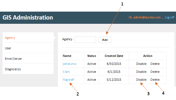 Disabling an agency keeps the agency’s map configuration information but prevents it from being used. Before you can disable an agency, set the agency administrators to Inactive status.