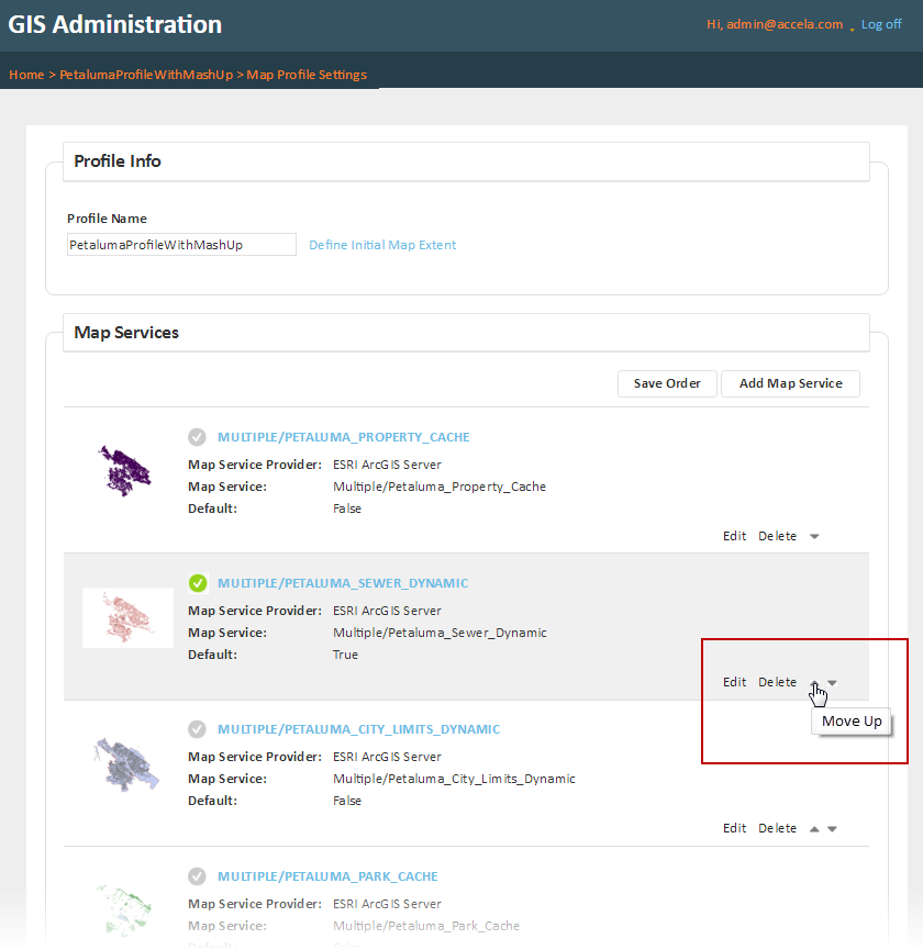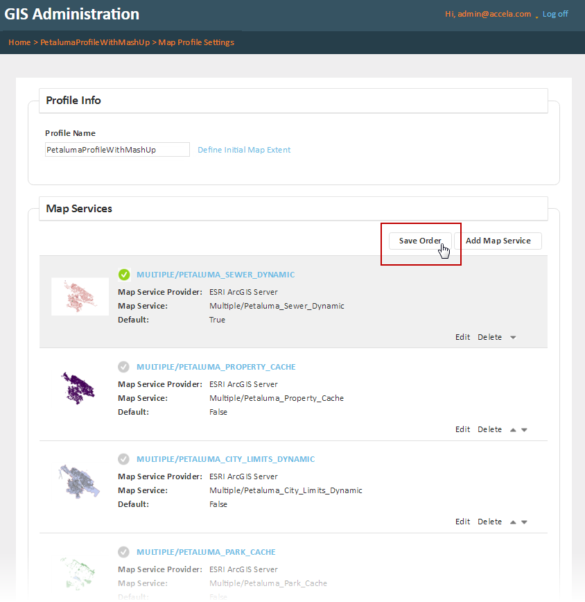- After you are done re-arranging the map service order, click Save Order. For example: