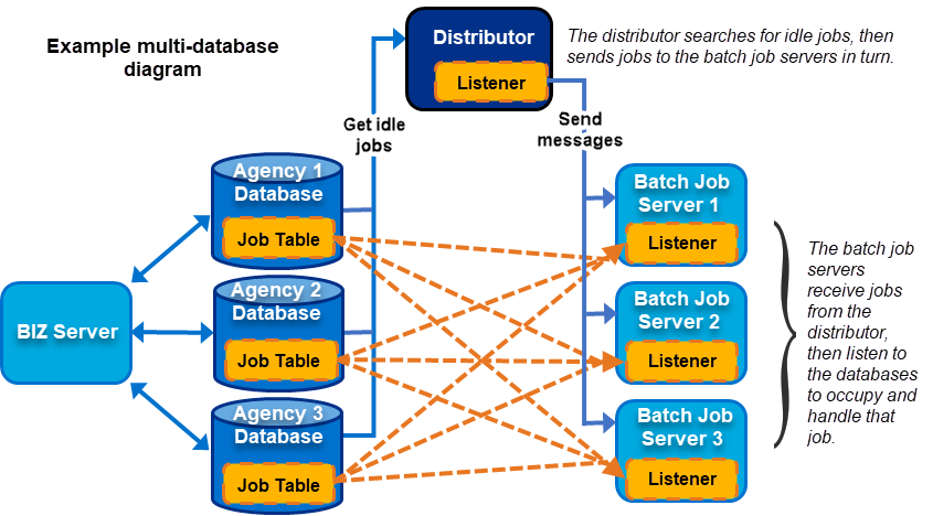 A new batch job server design targets a multi-database architecture to improve performance. An independent common distributor server (based on the BIZ server) listens for job messages from each database, then distributes jobs in turn to batch job servers. Each batch job server then handles the job based on the status and keeps track of that job as necessary.